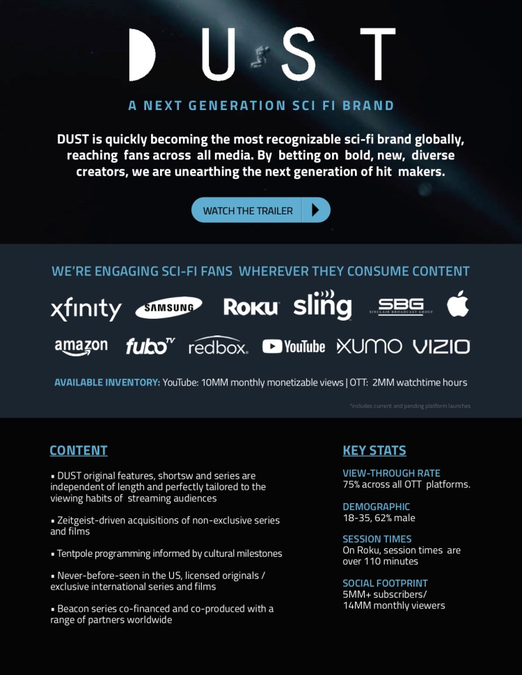 WHAT IS IT?: DUST is the leading destination and studio for premium science fiction entertainment and experiences. DUST reaches passionate sci-fi fans across all social channels, a flagship podcast and a linear free-to-view OTT channel, exploring the future of humanity through the lens of science and technology. The studio is home to over 500 filmmakers from over 50 countries. The studio has produced multiple films, TV series, podcasts, and digital platforms.